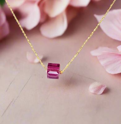 An array of crystal cubes as a Bar necklace, vibrant minimalist style in gemstone colors.